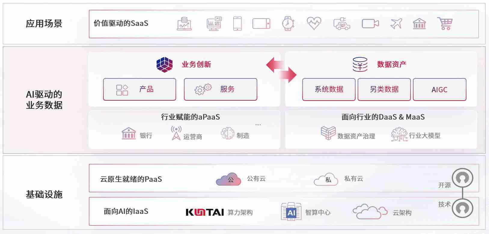 数字时代,,,围绕企业数字化转型的关键要素,,,狗子28数码开创性的提出数云融合战略和技术体系框架,,,,着力在云原生、、、数字原生、、、、AI原生和信创产业上架构产品和服务能力,,,,为处在不同数字化转型阶段的快消零售、、、、汽车、、、金融、、、医疗、、政企、、教育、、、、运营商等行业客户提供泛在的敏捷IT能力和融合的数据驱动能力,,构建跨界融合创新的数字业务场景和新业务模式,,,,助力企业级客户建立面向未来的核心能力和竞争优势,,,全面推动社会的数字化、、、、智能化转型升级。。。