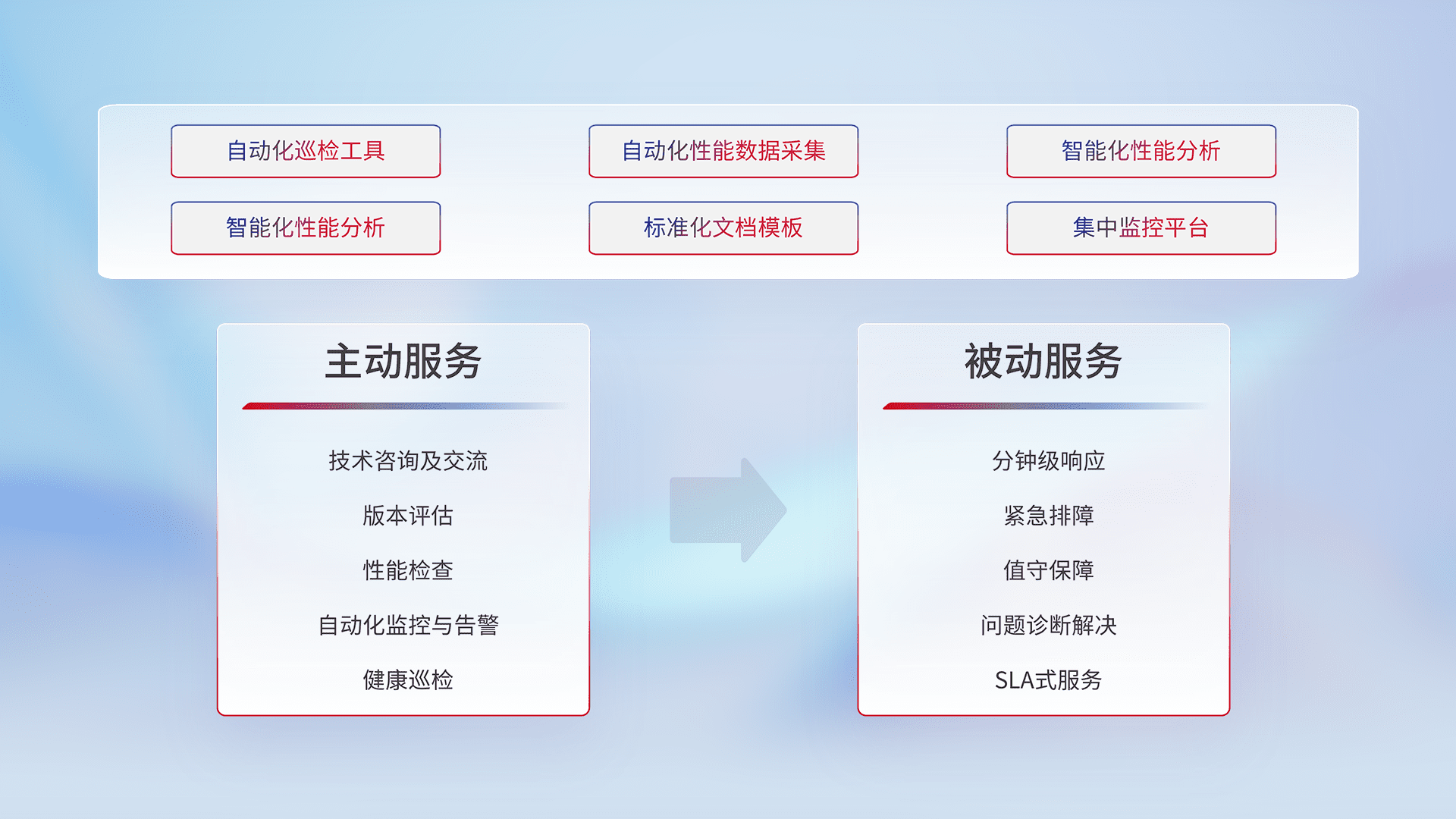 智能化工具和标准化文档,,,,保障服务质量,,,,提供主动服务(包含技术咨询、、、版本评估、、、性能检查、、自动化监控与告警、、健康巡检)和被动服务包含(分钟级响应、、、、紧急排障、、、、值守保障、、、、问题诊断解决、、、SLA服务)。。。